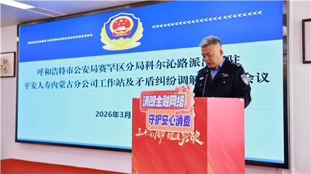 2026年3月12日,呼和浩特市公安局赛罕区分局科尔沁路派出所联合平安人寿内蒙古分公司,在该公司举行“警企联动”纠纷调解机制成立会议暨揭牌仪式,正式设立科尔沁路派出所驻平安人寿内蒙古分公司工作站及矛盾纠纷调解室。此次举措是科尔沁路派出所践行新时代“枫桥经验”、优化营商环境、守护群众金融安全的重要实践,切实将警务职能向金融领域延伸,创新矛盾纠纷化解模式,为构建金融安全与社会治理协同发展新格局注入警务新动能。
