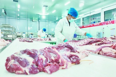 工人正在分割“西旗羊肉”。(摄影:胡民)