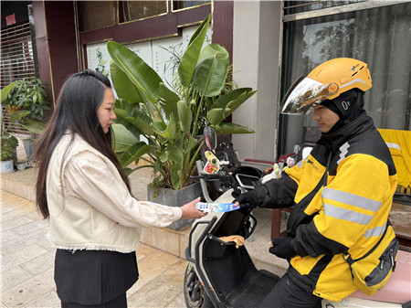 在昆明,光大银行联合洛龙湖社区共建“骑手金融知识驿站”,同时招募30余名骑手成为我行“阳光消保大使”,将金融风险提示贴纸和折页随餐送到市民手中。骑手王师傅表示:“送餐路上多一句提醒,就能少一个人被骗,这份‘爱心订单’我们送得自豪!”