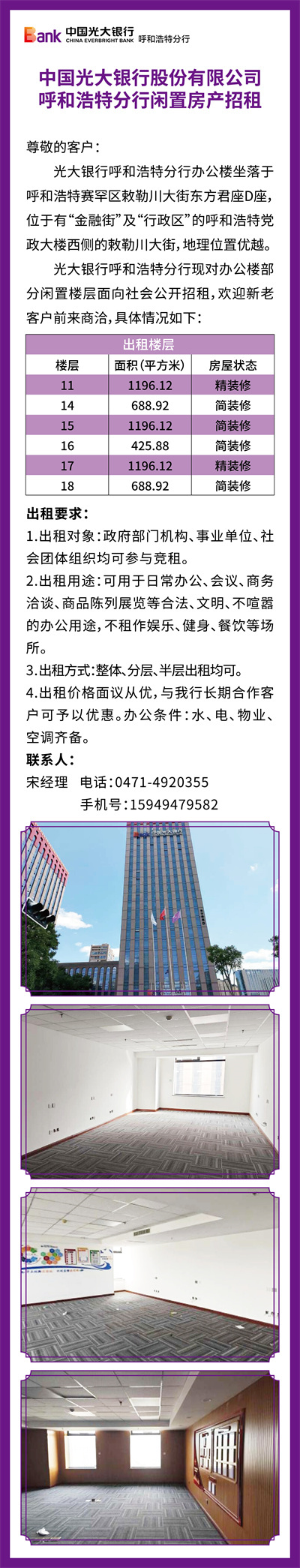 中国光大银行股份有限公司呼和浩特分行闲置房产招租